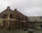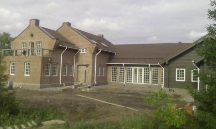 Дом в Кондакопшино, комбинированный, левое крыло в два этажа из поризованyого керамического блока, с отделкой клинкерным кирпичом, правое крыло из клеёного бруса, на ж/б плите, кровля натуральная черепица.